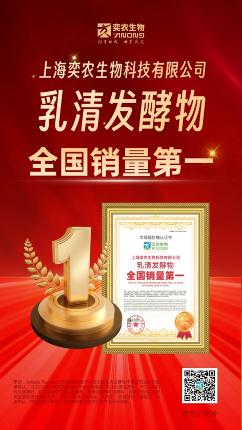 在食品行业蓬勃发展的当下,“0添加”、清洁标签等理念已成为消费者追求的主流。上海奕农的乳清发酵物凭借卓越的品质与市场销量,荣获iiMedia Research(艾媒咨询)授予的“乳清发酵物全国销量第一”的市场地位确认证书。这一证书不仅是对上海奕农生物乳清发酵物产品的高度认可,更是对公司在天然防腐领域不懈努力的有力见证。